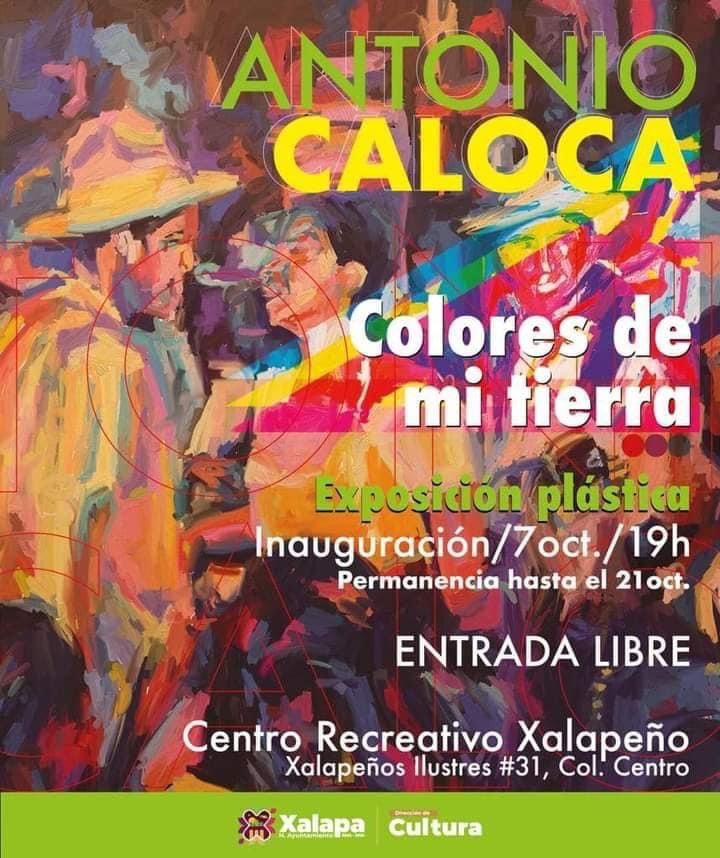Xalapa, Ver.- Para mostrar su visión influenciada por el folclore mexicano y la cultura de occidente, el pintor, escultor y muralista Antonio Caloca, inaugurará el próximo 7 de octubre, a las 19:00 horas, su exposición “Colores de mi Tierra”, en el Centro Recreativo Xalapeño (CRX).