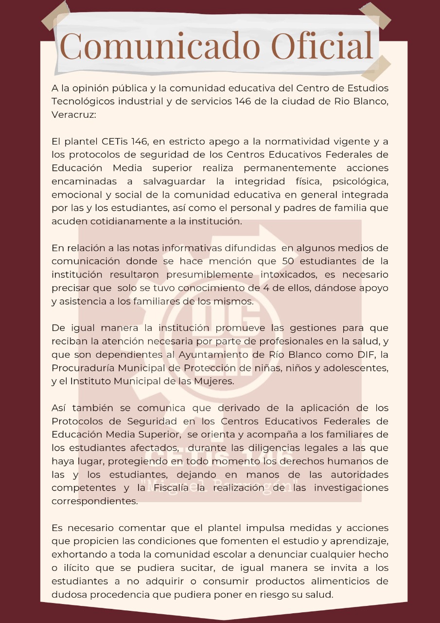 Río Blanco, Ver.- Ante la serie de rumores que se suscitaron en donde se mencionaba que 50 alumnos del CETis 146 de Río Blanco se habían intoxicado por presuntamente comer pastelillos con mariguana, esa institución confirmó que hubo unos estudiantes intoxicados pero se trató únicamente de cuatro.