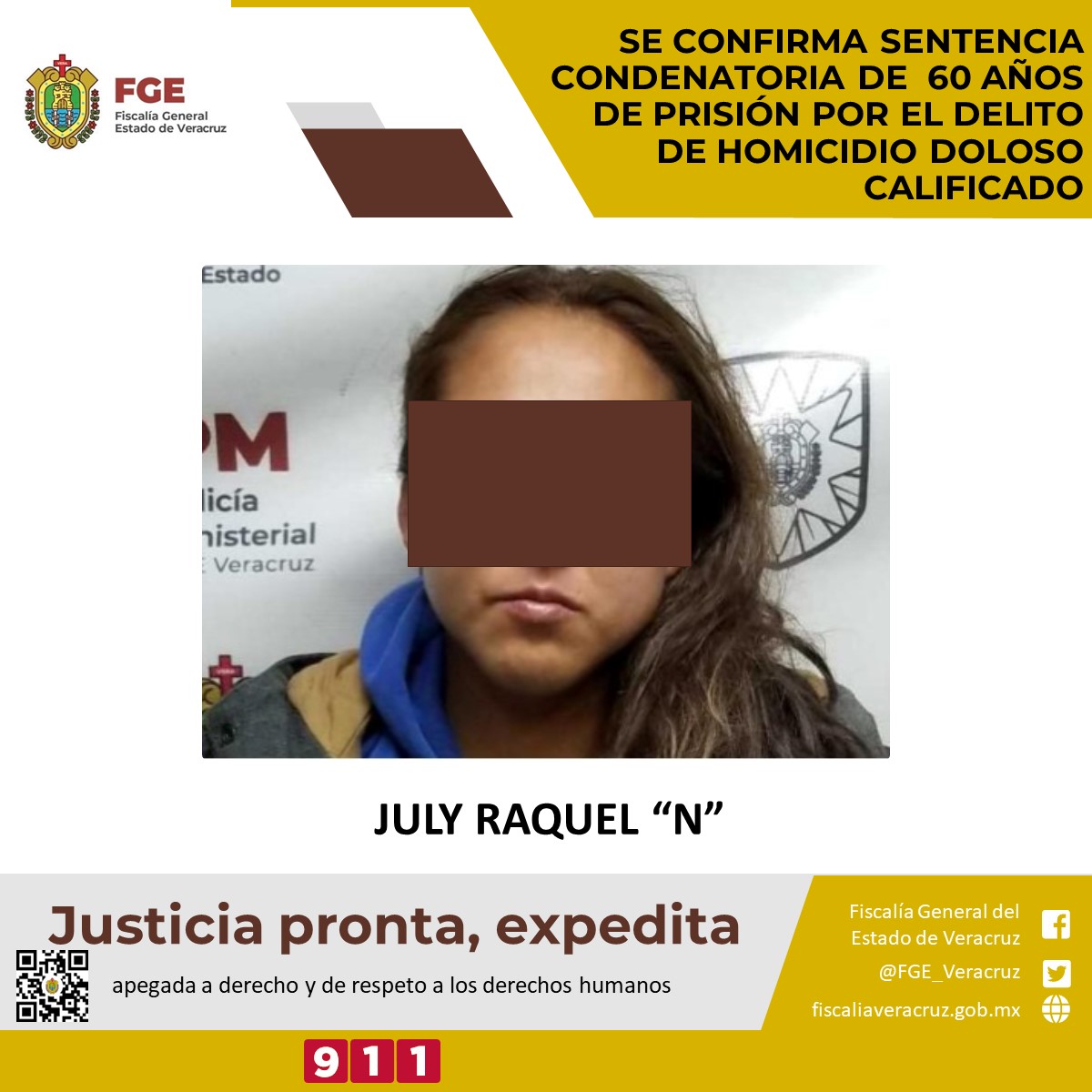 Pacho Viejo.- La Fiscalía Especializada en Investigación de Delitos de Violencia contra la Familia, Mujeres, Niñas, Niños y de Trata de Personas, confirmó la sentencia condenatoria de 60 años de prisión en contra de July Raquel “N”, por el delito de homicidio doloso calificado en agravio de la rectora de la Universidad Valladolid en Xalapa.