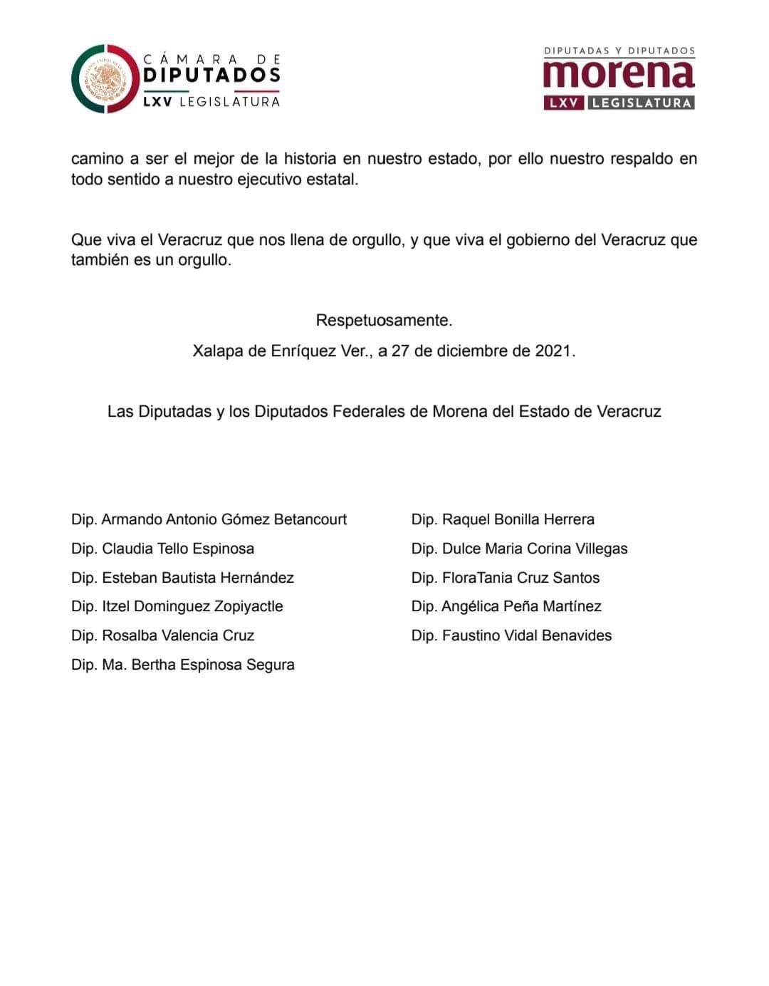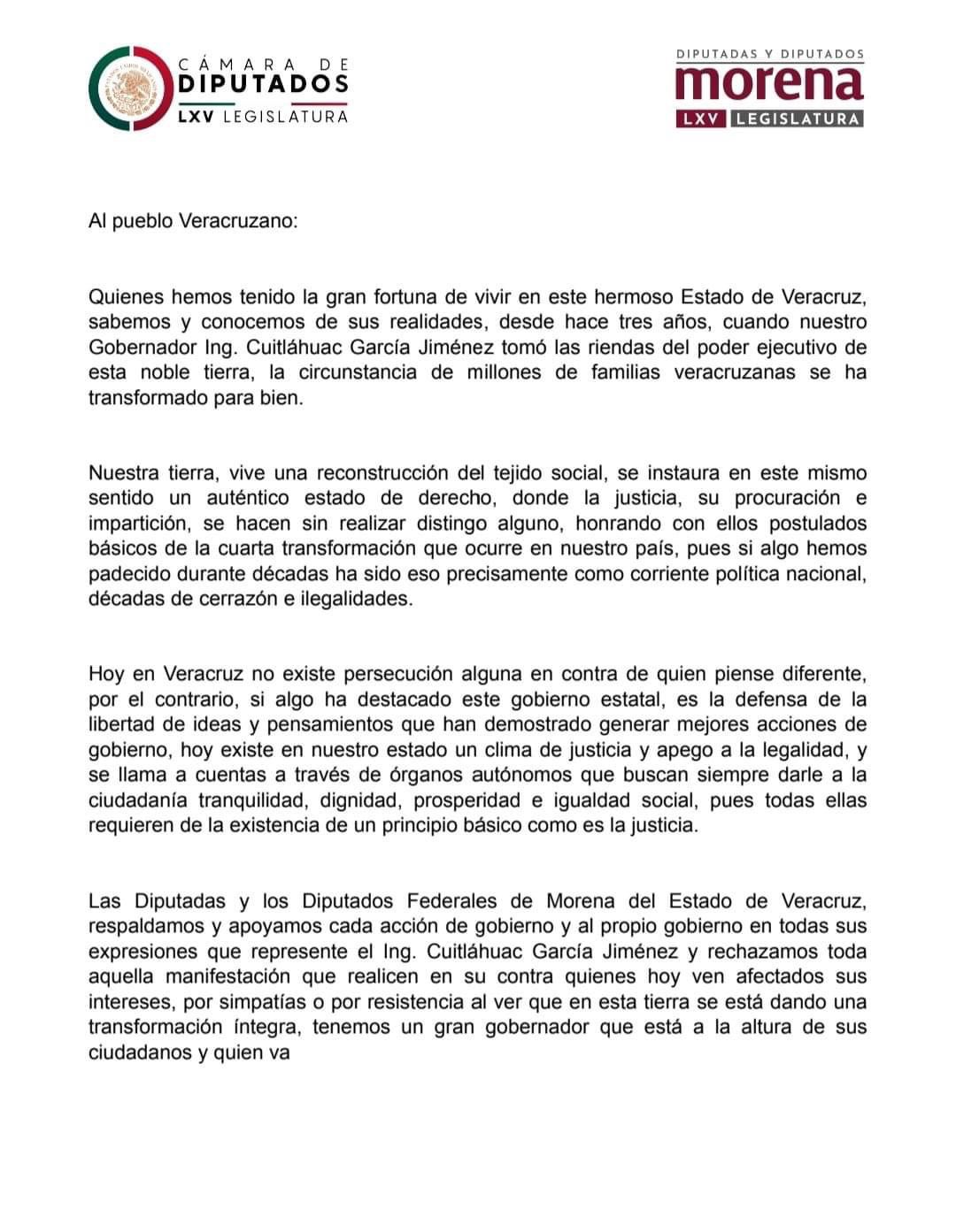 Xalapa, Ver.- A través de un comunicado, diputadas y diputados federales de Morena negaron que exista persecución en Veracruz y expresaron su respaldo al gobernador Cuitláhuac García Jiménez.