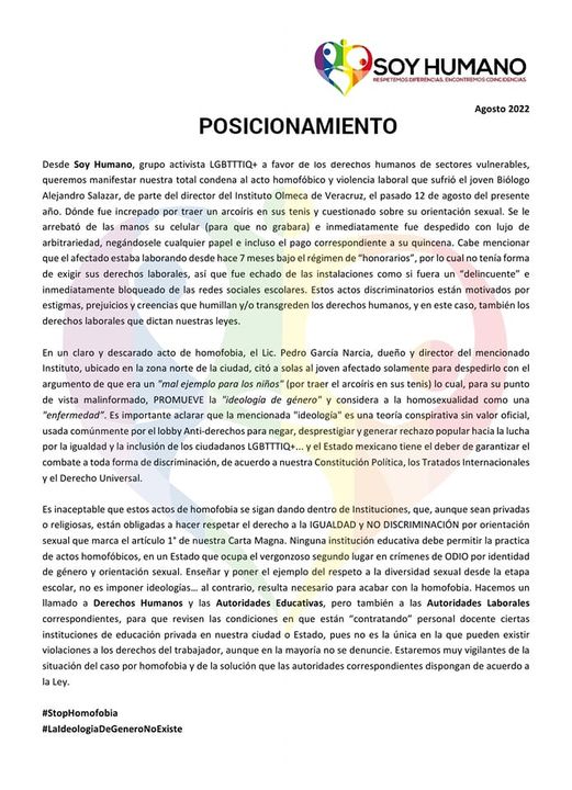 «Es un claro y descarado actor homofóbico, el Lic. Pedro García Narcia, dueño y director del mencionado instituto, ubicado en la zona norte de la ciudad, citó a solas al joven afectado, solamente para despedirlo bajo el argumento de que ‘era un mal ejemplo para los niños‘ (por traer el arcoíris en sus tenis) lo cual, para su punto de vista mal informado, PROMUEVE la ‘ideología de género’, y considera a la homosexualidad como una ‘enfermedad’. Es importante aclarar que la mencionada ideología es una teoría conspirativa sin valor oficial, usada comúnmente por el lobby antiderechos para negar, desprestigiar y generar rechazo popular hacia la lucha por la igualdad y la inclusión de los ciudadanos LGBT», se menciona en parte del comunicado.