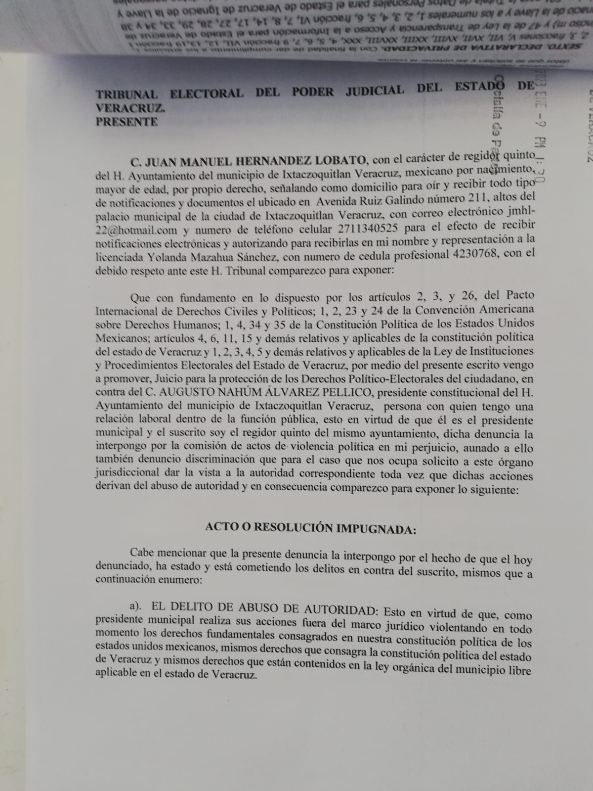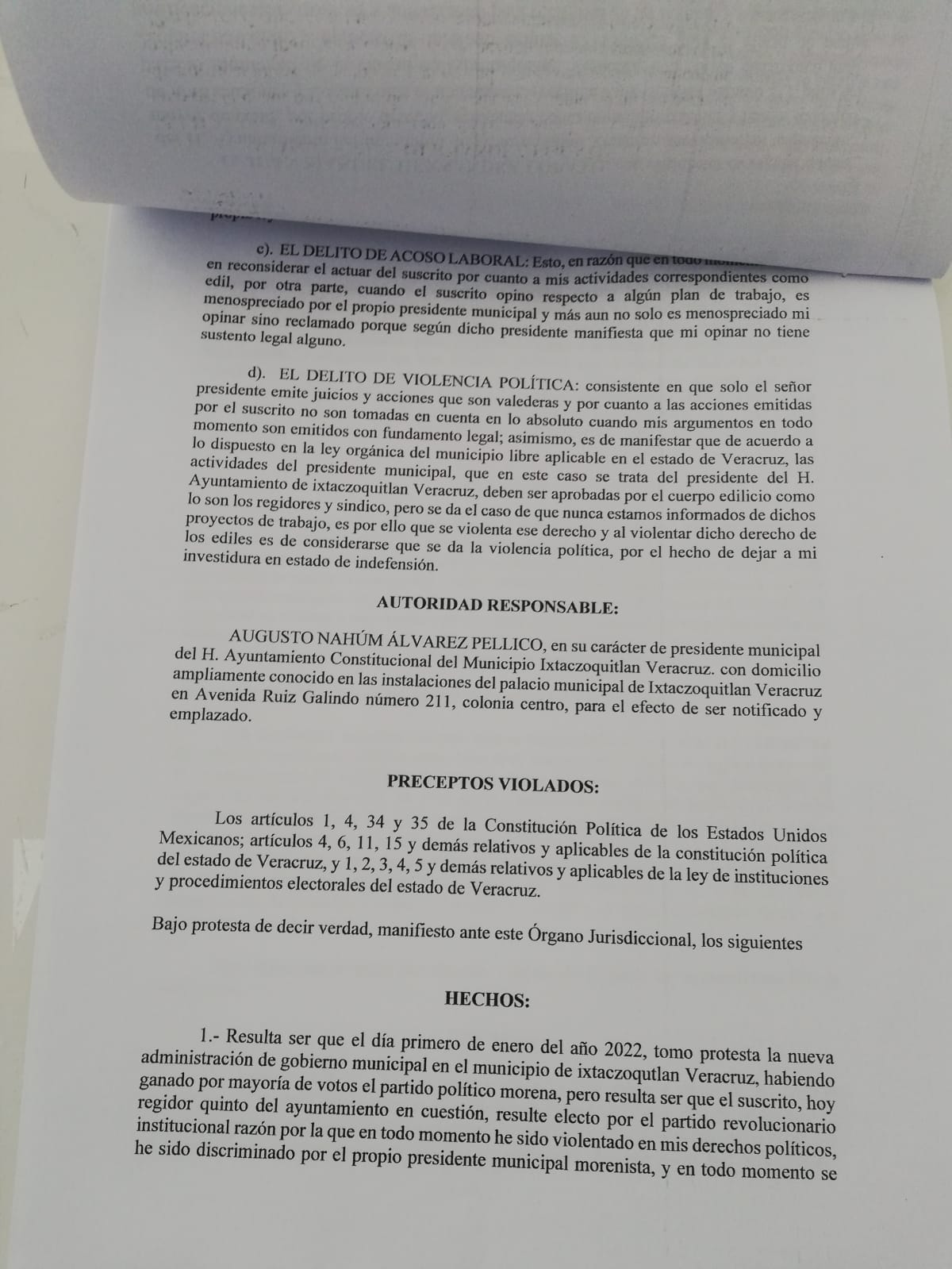 Ixtaczoquitlán, Ver.- Debido a que consideran que el alcalde Nahum Álvarez Pellico se encuentra obstaculizando su labor como regidores y los discrimina, los regidores Óscar Miguel Maciel Dorantes, Juan Manuel Hernández Lobato y María de los Ángeles Hernández Ochoa, interpusieron un juicio para la protección de sus derechos político-electorales ante el Tribunal Electoral de Veracruz (TEV).
