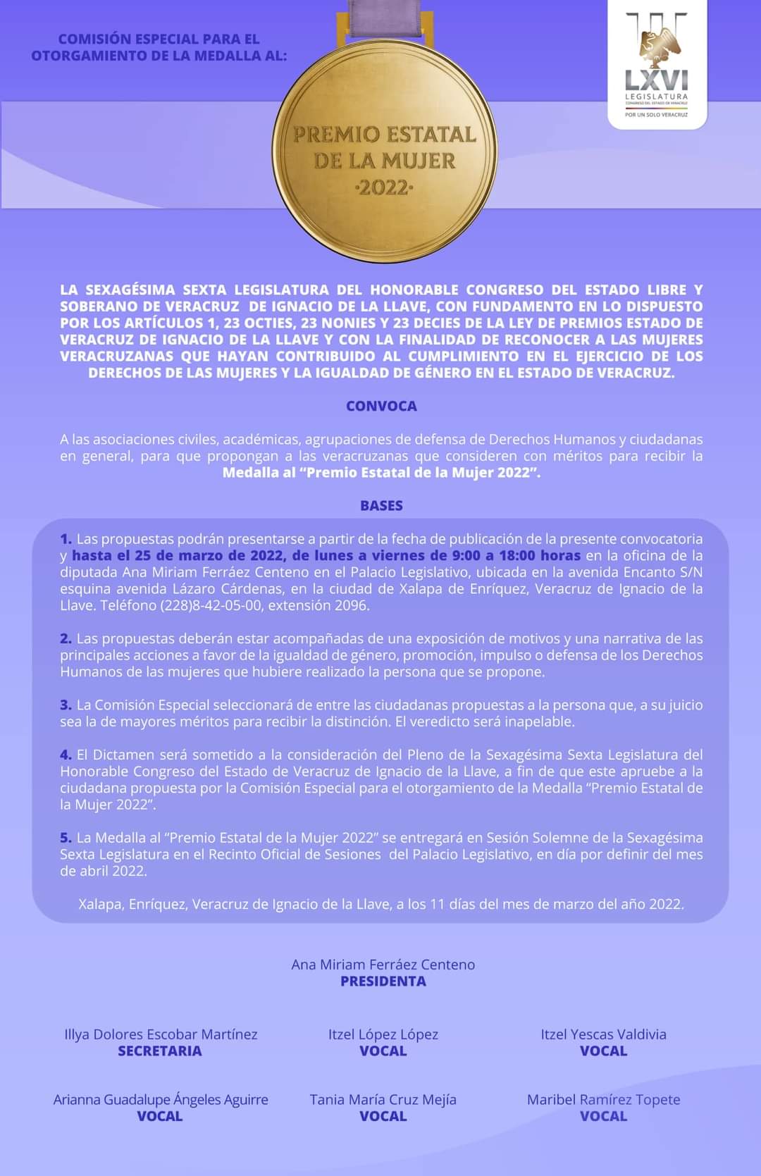 Xalapa, Ver.- El Congreso de Veracruz emitió la convocatoria para otorgar la medalla “Premio Estatal de la Mujer” 2022.