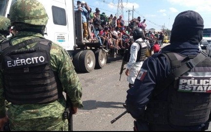 En el sitio se observó un autobús y tres camionetas del Instituto Nacional de Migración (INM) disponibles para que los extranjeros sin documentación los aborden; así como elementos del Ejército, Guardia Nacional y Secretaría de Seguridad Pública, para protegerlos de la delincuencia.
