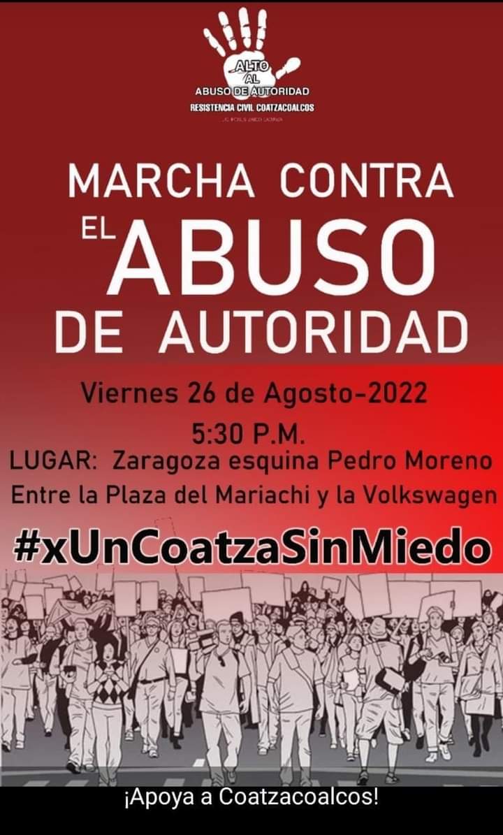 Xalapa, Ver.- Pobladores de Coatzacoalcos realizarán este 26 de agosto una marcha pacífica para exigir a las autoridades detener la violencia, inseguridad y abusos policiacos de los que son víctimas.