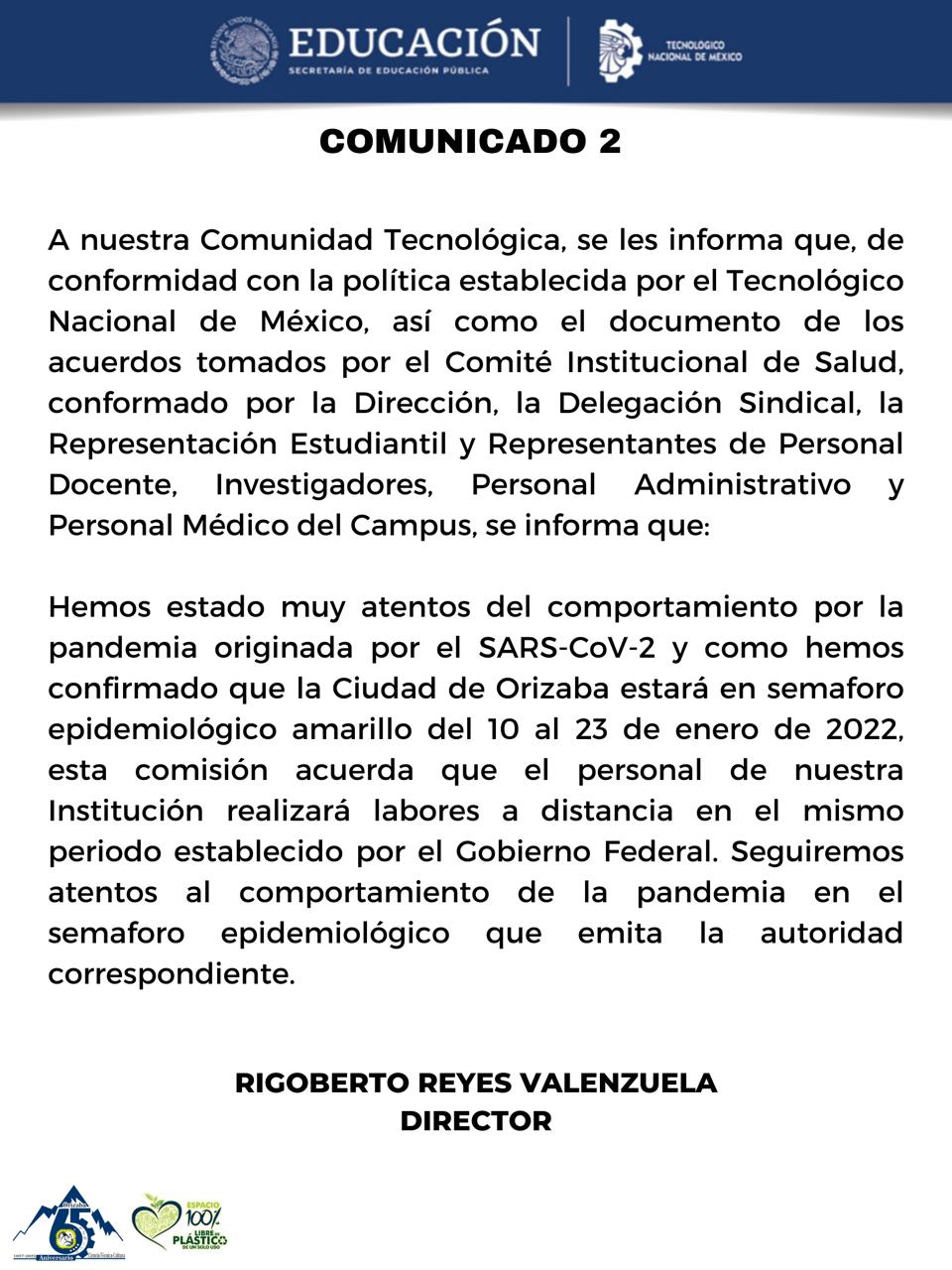 Orizaba, Ver.- Por considerar que no se tienen las condiciones para regresar a clases presenciales, el Tecnológico Nacional de México (TecNM) Campus Orizaba decidió mantener trabajos virtuales del 10 al 23 de enero.