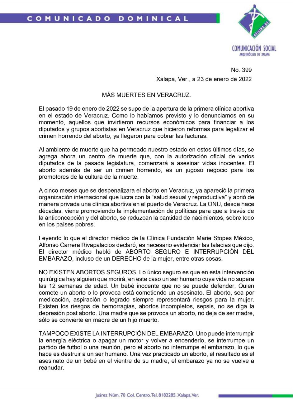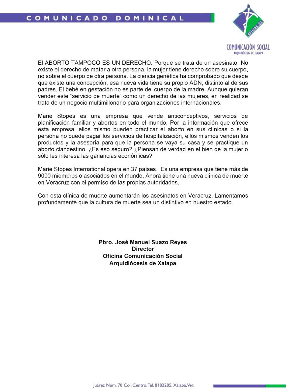 En su comunicado dominical, el presbítero José Manuel Suazo Reyes, vocero de la Arquidiócesis de Xalapa, la calificó como «clínica de muerte».