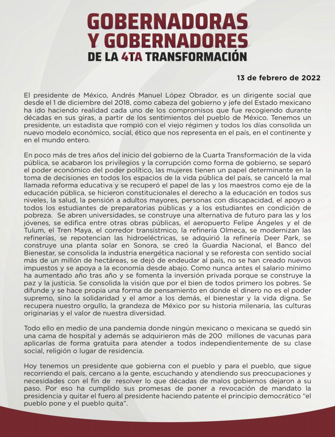 Las y los gobernadores, entre ellos, el gobernador de Veracruz, refieren que hoy tenemos un presidente que gobierna con el pueblo y para el pueblo, «que sigue recorriendo el país cercano a la gente, escuchando y atendiendo sus preocupaciones y necesidades con el fin de resolver lo que décadas de malos gobiernos dejaron a su paso. Por eso ha cumplido sus promesas de poner a revocación de mandato la presidencia y quitar el fuero al presidente haciendo patente el principio democrático «el pueblo pone y el pueblo quita».