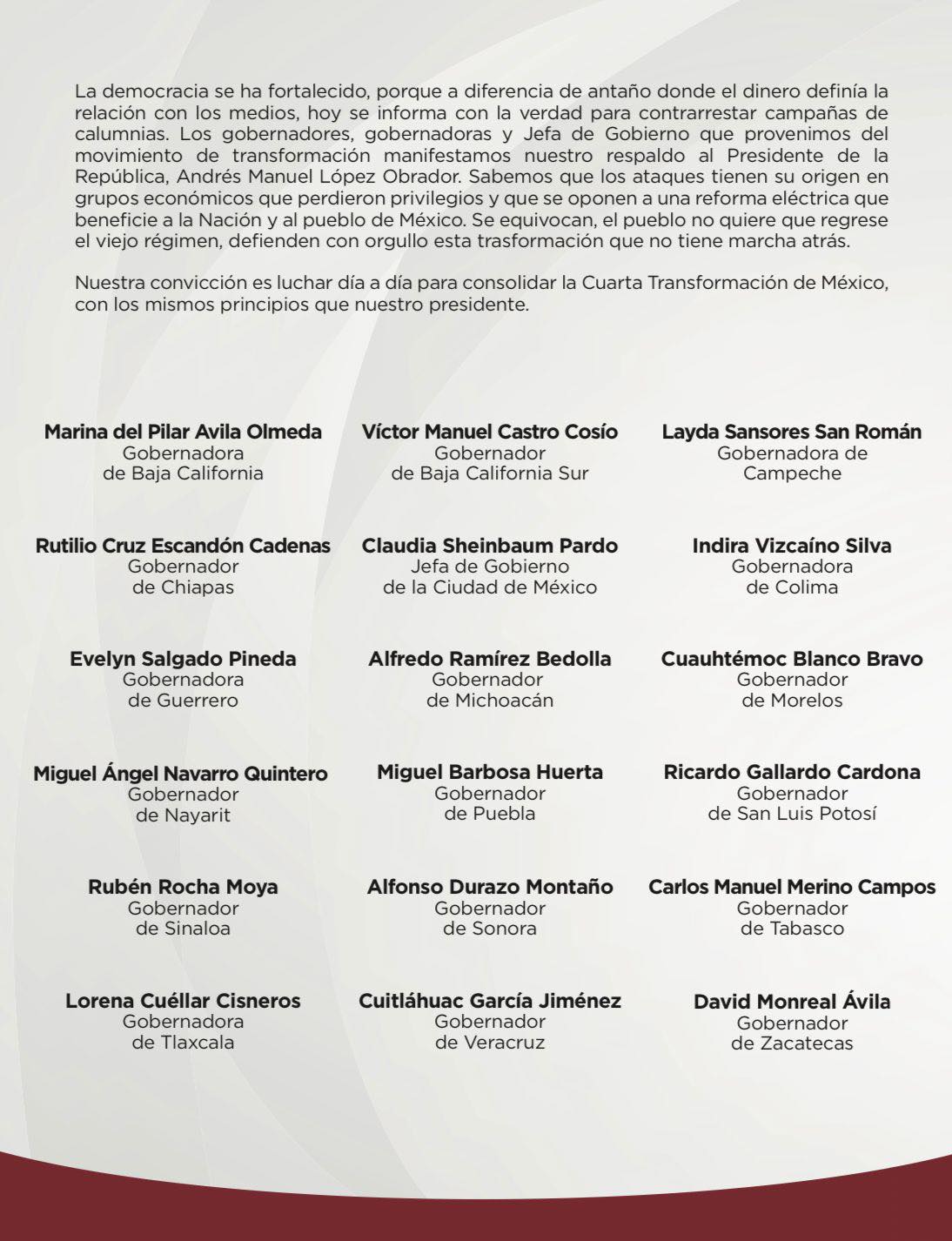 Gobernadores, gobernadoras y la jefa de gobierno de la CDMX, expresaron su respaldo al presidente Andrés Manuel López Obrador, ante «los ataques» que atribuyen a grupos económicos que perdieron privilegios y que se oponen a una reforma eléctrica que beneficie a la Nación y al pueblo de México.